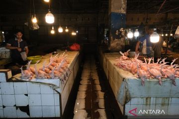 Dua pedagang daging ayam menunggu pembeli di Pasar Korem, Kendari, Sulawesi Tenggara, Rabu (24/9/2025). Kementerian Pertanian berupaya mengendalikan harga daging ayam yang naik pada September 2025 dari Rp36 ribu per kilogram menjadi Rp38 ribu ribu per kilogram dengan membantu distribusi ayam ke berbagai daerah serta mengawasi penetapan harga dikonsumen bersama asosiasi perunggasan dan pemerintah daerah agar tetap menguntungkan peternak dan tidak membebani konsumen. ANTARA FOTO/Andry Denisah/bar