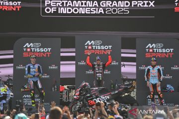 Pembalap Aprilia Racing Marco Bezzecchi memacu kecepatan sepeda motornya saat memasuki garis finis dalam sesi Sprint Race MotoGP Indonesia 2025 di Sirkuit Internasional Pertamina Mandalika, Lombok Tengah, Nusa Tenggara Barat, Sabtu (4/10/2025). Marco Bezzecchi menjuarai sesi tersebut dengan finis tercepat pertama dengan total waktu 19 menit 37,047 detik disusul Fermin Aldeguer di posisi kedua dan Raul Fernandez di posisi ketiga. ANTARA FOTO/Aditya Pradana Putra/agr