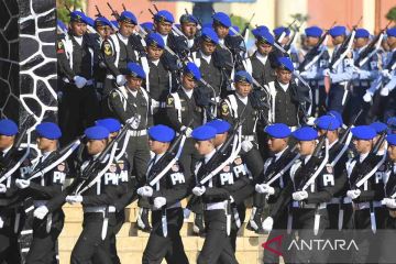 Personel PM TNI AD berbaris saat menjadi pasukan upacara peringatan Hari Kesaktian Pancasila di Monumen Pancasila Sakti, Lubang Buaya, Jakarta, Rabu (1/10/2025). Hari Kesaktian Pancasila 2025 mengusung tema Pancasila Perekat Bangsa Menuju Indonesia Raya. ANTARA FOTO/Hafidz Mubarak A/rwa.