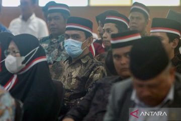 Sejumlah pengikut Negara Islam Indonesia (NII) faksi Muhammad Yusuf Thohiri (MYT) mengikuti acara cabut bai'at dan Ikrar setia kepada Negara Kesatuan Republik Indonesia (NKRI) di Tangerang, Banten, Rabu (1/10/2025). Sebanyak 56 orang mantan petinggi dan pengikut NII faksi MYT melakukan ikrar kembali ke pangkuan NKRI dan mengembalikan pemahaman terhadap nilai-nilai Pancasila dan UUD 1945 yang menjadi dasar Negara Kesatuan Republik Indonesia. ANTARA FOTO/Muhammad Iqbal/sgd